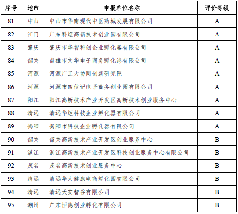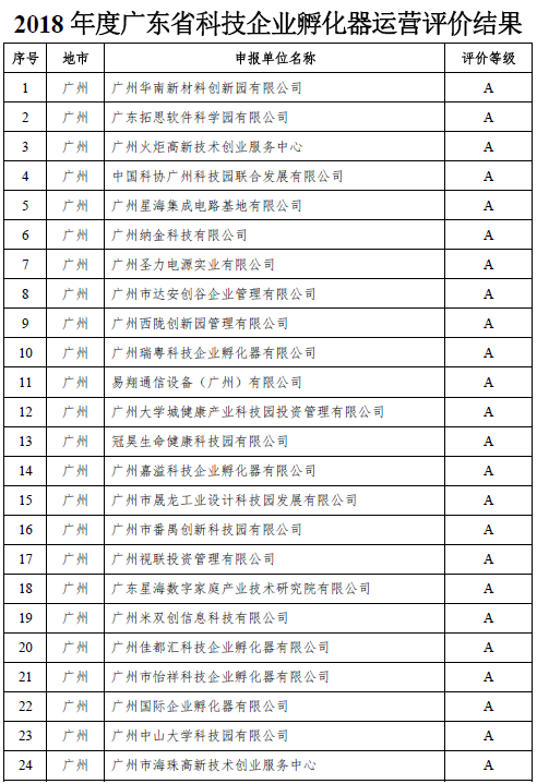 為貫徹落實《廣東省科學技術廳 廣東省財政廳關于科技企業孵化器、眾創空間后補助試行辦法(修訂)》(粵科規范字〔2018〕1號)文件,省科技廳組織專家對自愿參加2018年度科技企業孵化器、眾創空間運營評價的單位進行評價。通過形式審查、定量指標初審、專家評審等程序,確定評為優秀(A級)的孵化器89家,評為良好(B級)的孵化器53家,評為合格(C級)的孵化器69家;評為優秀(A級)的眾創空間80家,評為良好(B級)的眾創空間92家,評為合格(C級)的眾創空間48家。