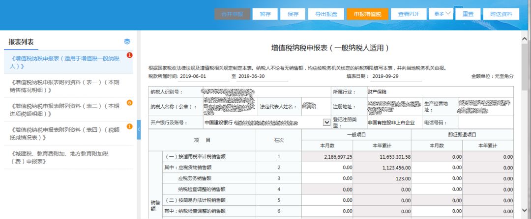 4)進入申報表頁面后,可看到系統左邊包括增值稅申報以及附加稅申報表,附加稅申報需在完成增值稅申報后,才能進行,因此,需先填寫增值稅申報表,填寫數據后,點擊【申報增值稅】按鈕,進行增值稅申報;
