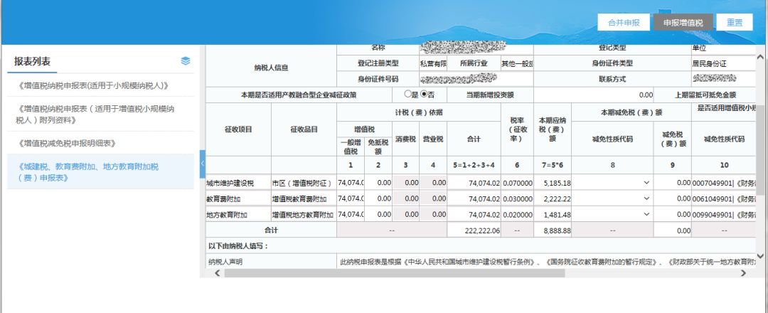 6)檢查附加稅數據,填寫完成相關數據項后,點擊【合并申報】按鈕,進行合并申報;