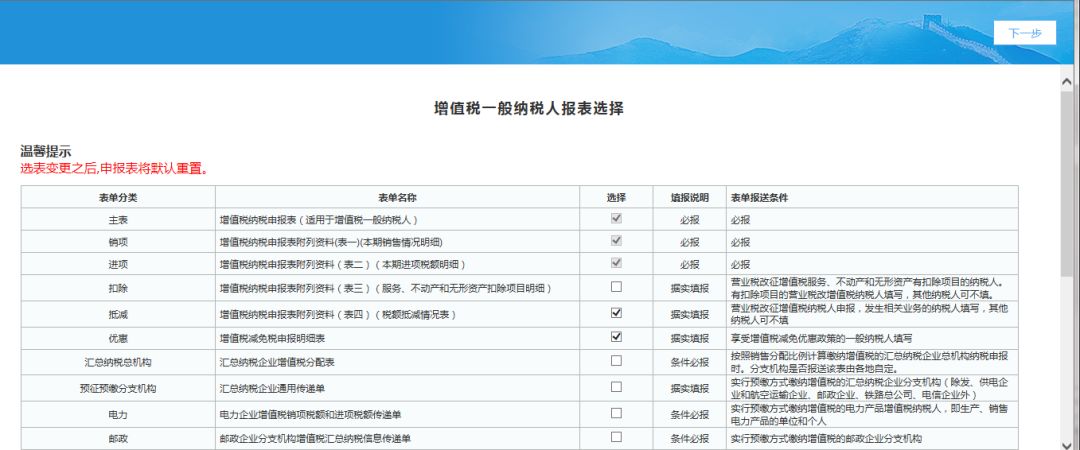 3)發票匯總界面點擊下一步按鈕,系統進入增值稅一般納稅人選表設置界面,企業根據自己實際業務發生情況勾選需報送的申報表,勾選完成點擊下一步進入增值稅納稅申報表,如下圖: