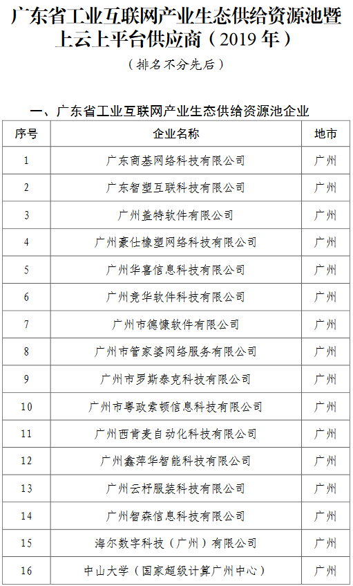 為推動(dòng)制造業(yè)數(shù)字化、網(wǎng)絡(luò)化、智能化轉(zhuǎn)型升級(jí),不斷發(fā)展壯大廣東工業(yè)互聯(lián)網(wǎng)產(chǎn)業(yè)生態(tài)體系,根據(jù)《廣東省工業(yè)和信息化廳辦公室關(guān)于組織申報(bào)廣東省工業(yè)互聯(lián)網(wǎng)產(chǎn)業(yè)生態(tài)供給資源池暨上云上平臺(tái)供應(yīng)商(2019年)的通知》(粵工信辦函〔2019〕30號(hào))和《廣東省工業(yè)和信息化廳關(guān)于印發(fā)廣東省工業(yè)企業(yè)上云上平臺(tái)服務(wù)券獎(jiǎng)補(bǔ)工作方案(2019)的通知》(粵工信工業(yè)互聯(lián)網(wǎng)函〔2019〕1553號(hào))文件要求,我廳先后組織開(kāi)展了2019年第一、二、三批廣東省工業(yè)互聯(lián)網(wǎng)產(chǎn)業(yè)生態(tài)供給資源池暨上云上平臺(tái)供應(yīng)商的申報(bào)和遴選工作。經(jīng)企業(yè)申報(bào)、專家評(píng)審和網(wǎng)上公示,現(xiàn)予以公布。