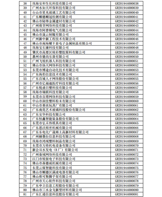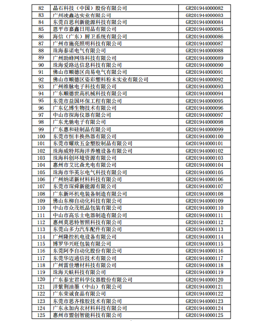 你們上報的《關于廣東省2019年高新技術企業認定備案的函》(粵科函高字〔2019〕1730號)收悉。現將公示無異議的東莞市英睿光電科技有限公司等3202家企業予以高新技術企業備案。請你們按照《廣東省2019年第一批高新技術企業名單》(詳見附件)中的企業名稱、高新技術企業證書編號和發證日期打印并頒發“高新技術企業證書”。