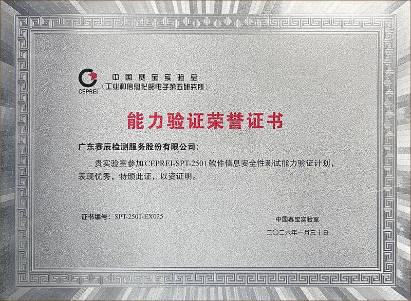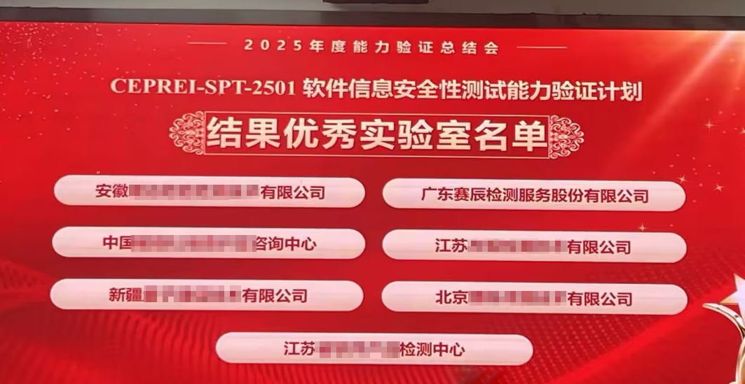 廣東賽辰檢測服務(wù)股份有限公司(簡稱"賽辰")憑借扎實(shí)的技術(shù)實(shí)力、規(guī)范的測試流程和穩(wěn)定的質(zhì)量管理水平,在CEPREI-SPT-2501軟件信息安全性測試能力驗(yàn)證中嚴(yán)格按照能力驗(yàn)證要求制定測試方案,編寫測試用例并反復(fù)驗(yàn)證,對測試結(jié)果進(jìn)行科學(xué)分析,獲得評審專家的高度認(rèn)可,以優(yōu)異成績脫穎而出,榮評"2025年度軟件信息安全性測試能力優(yōu)秀實(shí)驗(yàn)室"稱號。