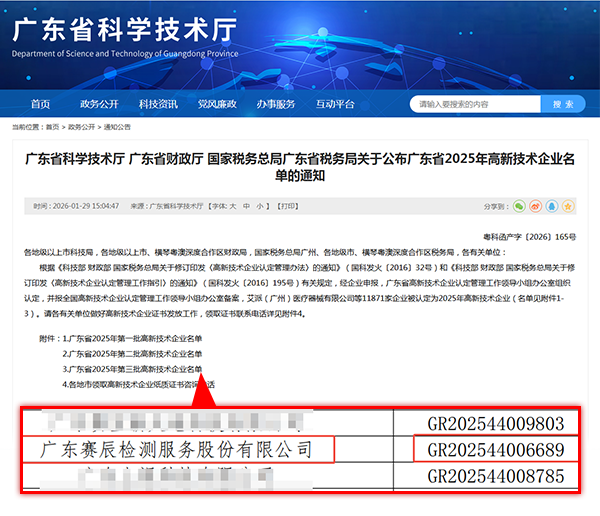 近日廣東省科學技術廳 廣東省財政廳 國家稅務總局廣東省稅務局關于公布廣東省2025年高新技術企業名單的通知,賽辰檢測憑借卓越的技術創新能力和扎實的研發實力,再次榮獲"高新技術企業"稱號。